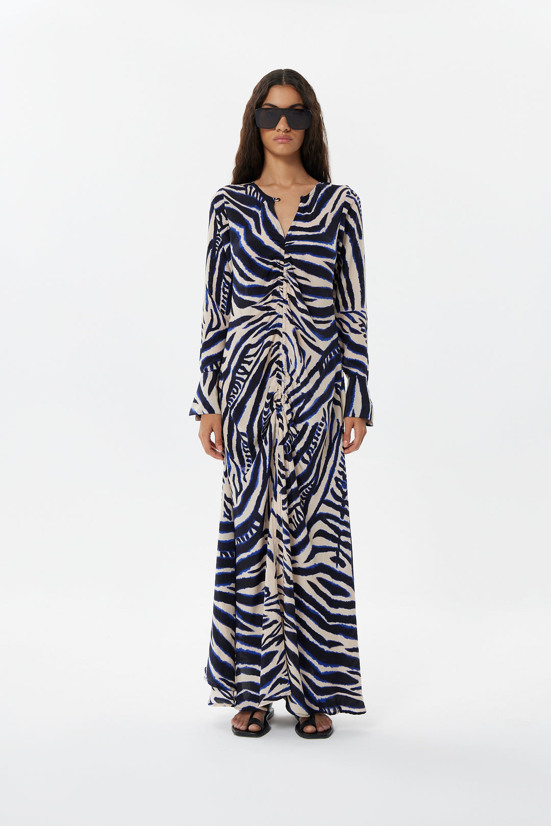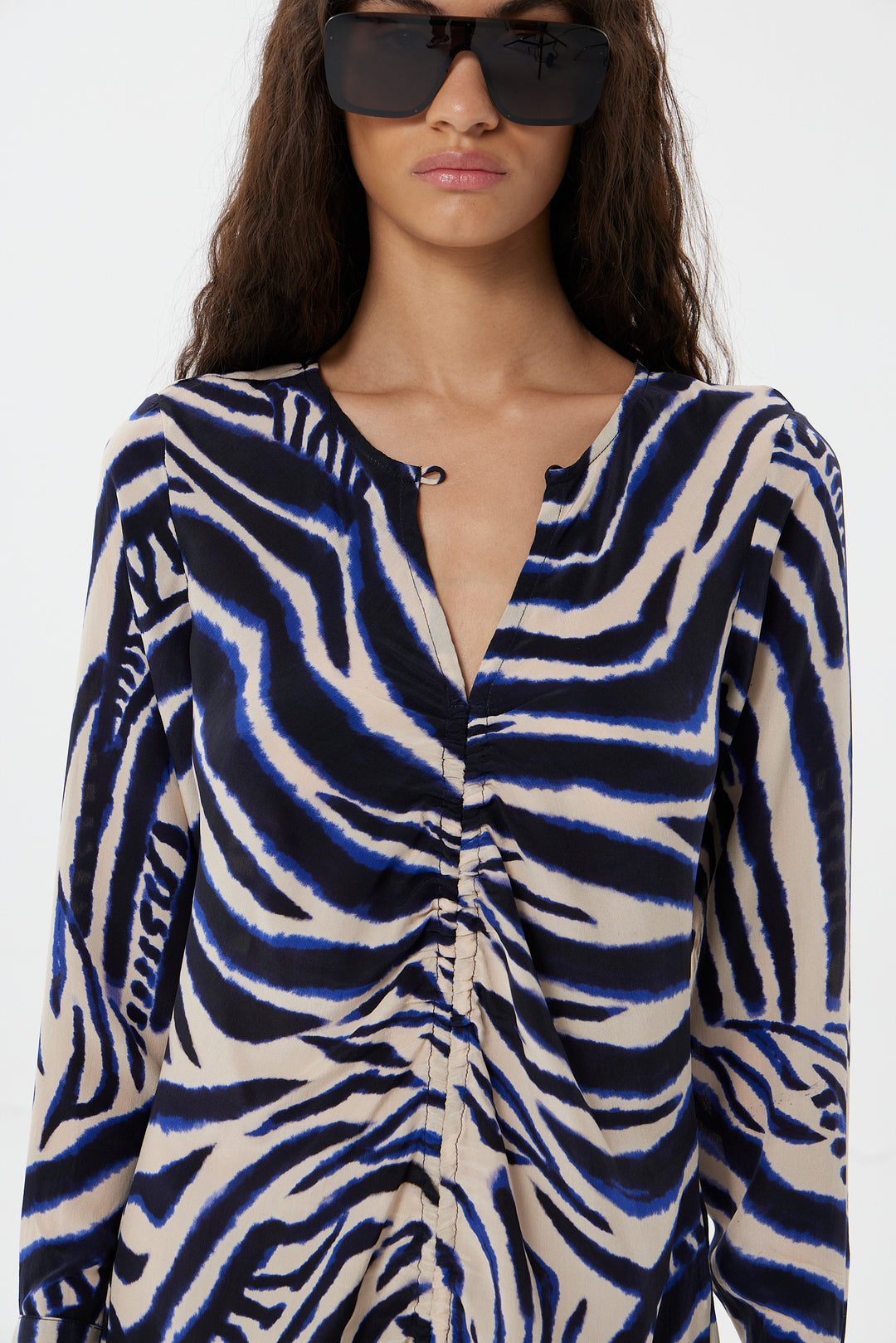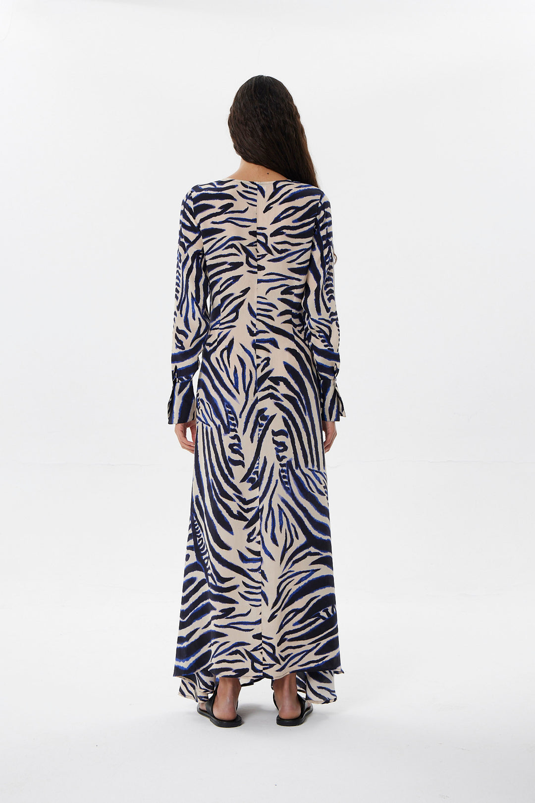 Mid-length printed silk dress 3/4-length puffed sleeves Button closing at the inner neckline edge.