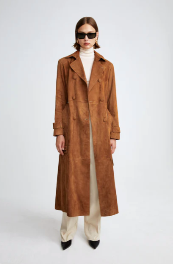A slim trench silhouette cut from ultra-lightweight, velvety suede. A double-breasted closure and double-length belt deliver an essential layering piece. Finished with suede covered buttons and a chic wrist band detail.