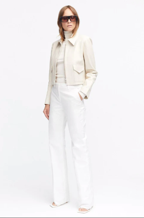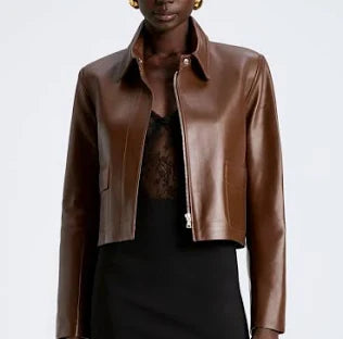 An indispensable, transitional piece cut from lightweight, buttery soft leather. This cropped silhouette looks equally as refined over a dress as paired with a trouser. It is suited with strong shoulders and finished with a face-framing collar, zip closure and two envelope pockets for essential items.