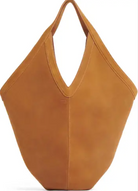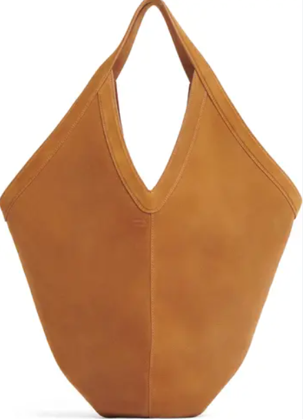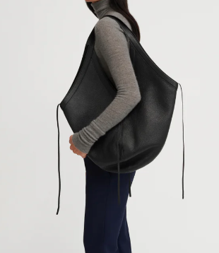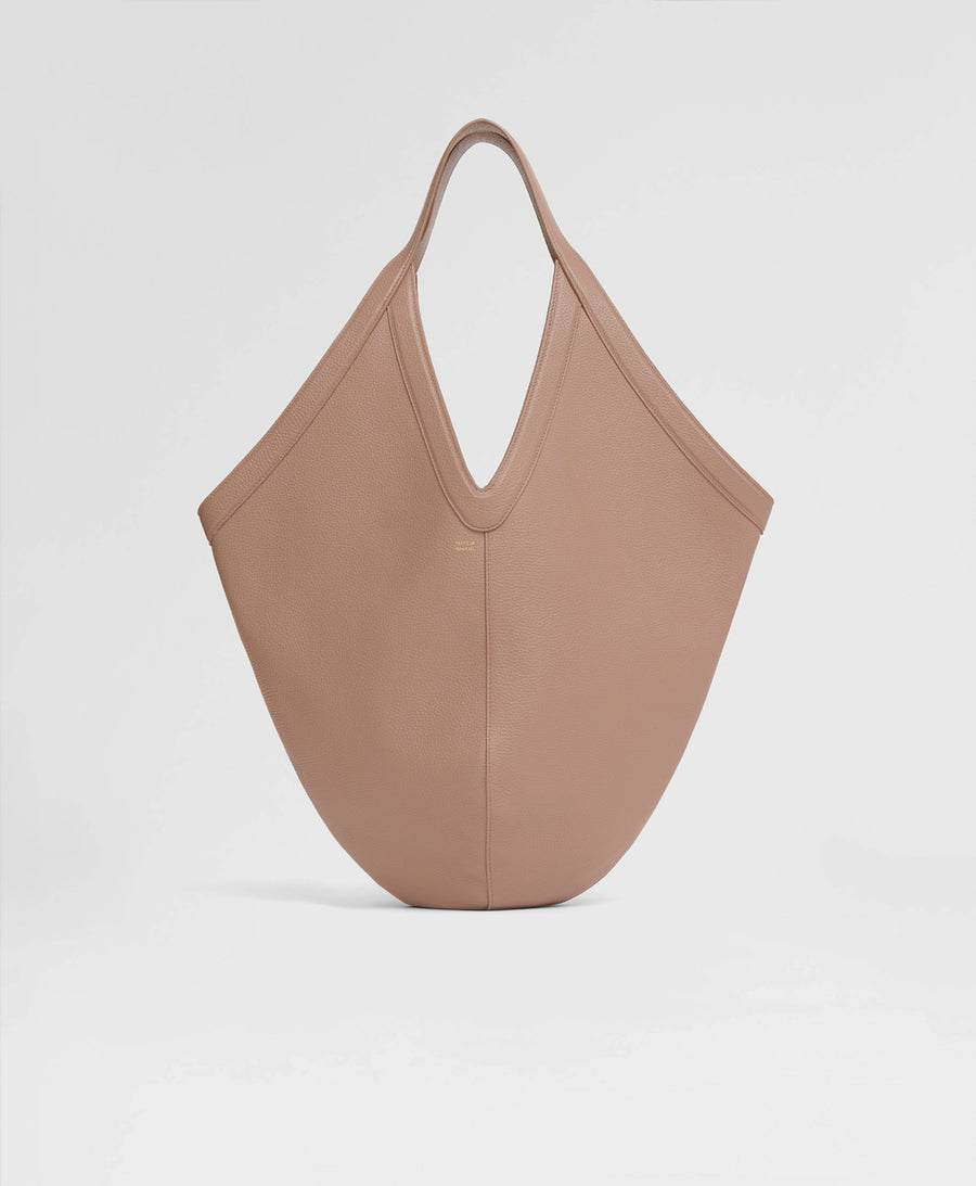 A sculptural shape subtly alludes to the 'M' in Mansur on a pebbled-leather shoulder bag detailed with a soft suede lining and slender tie closure. Made in Italy.