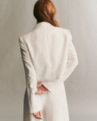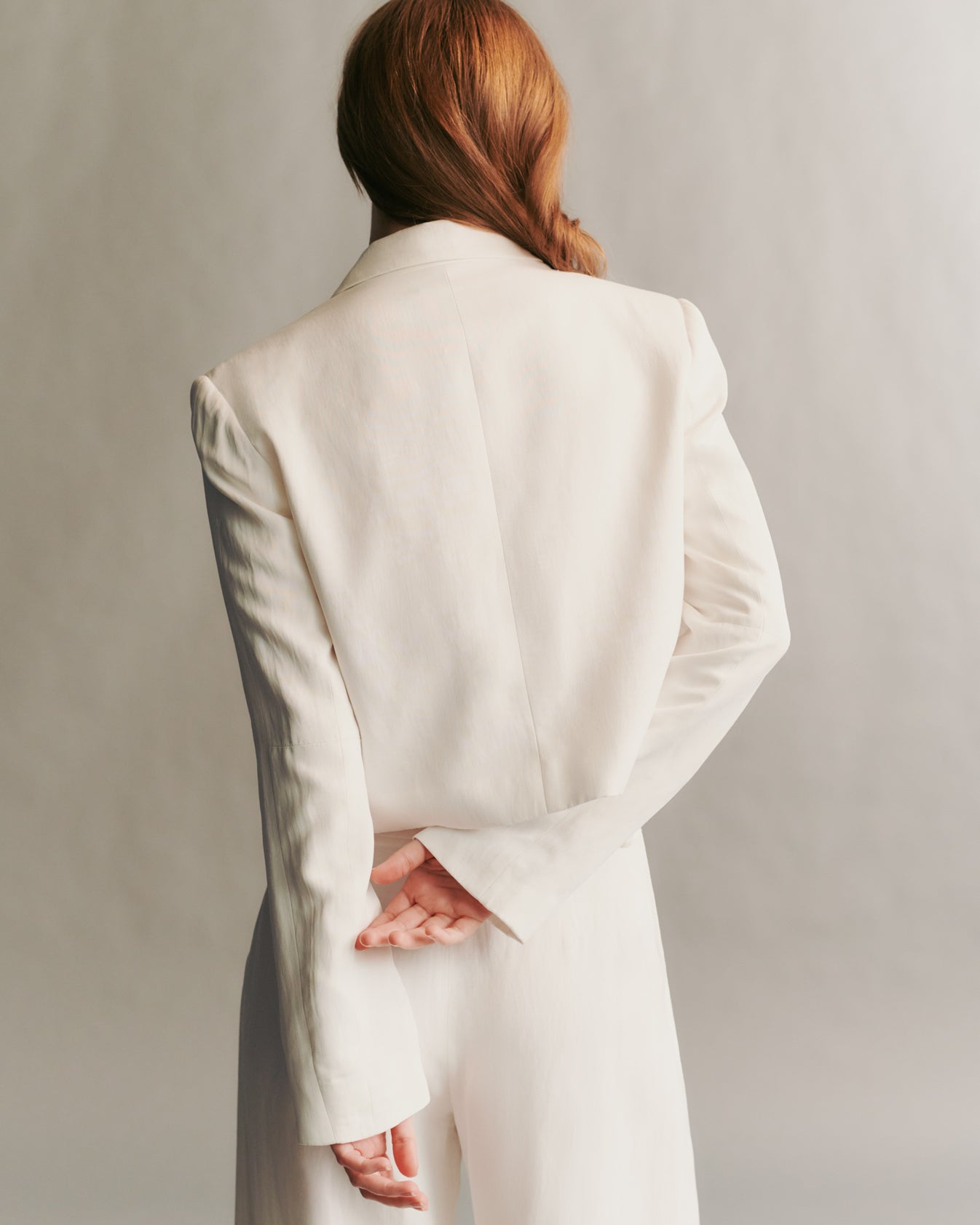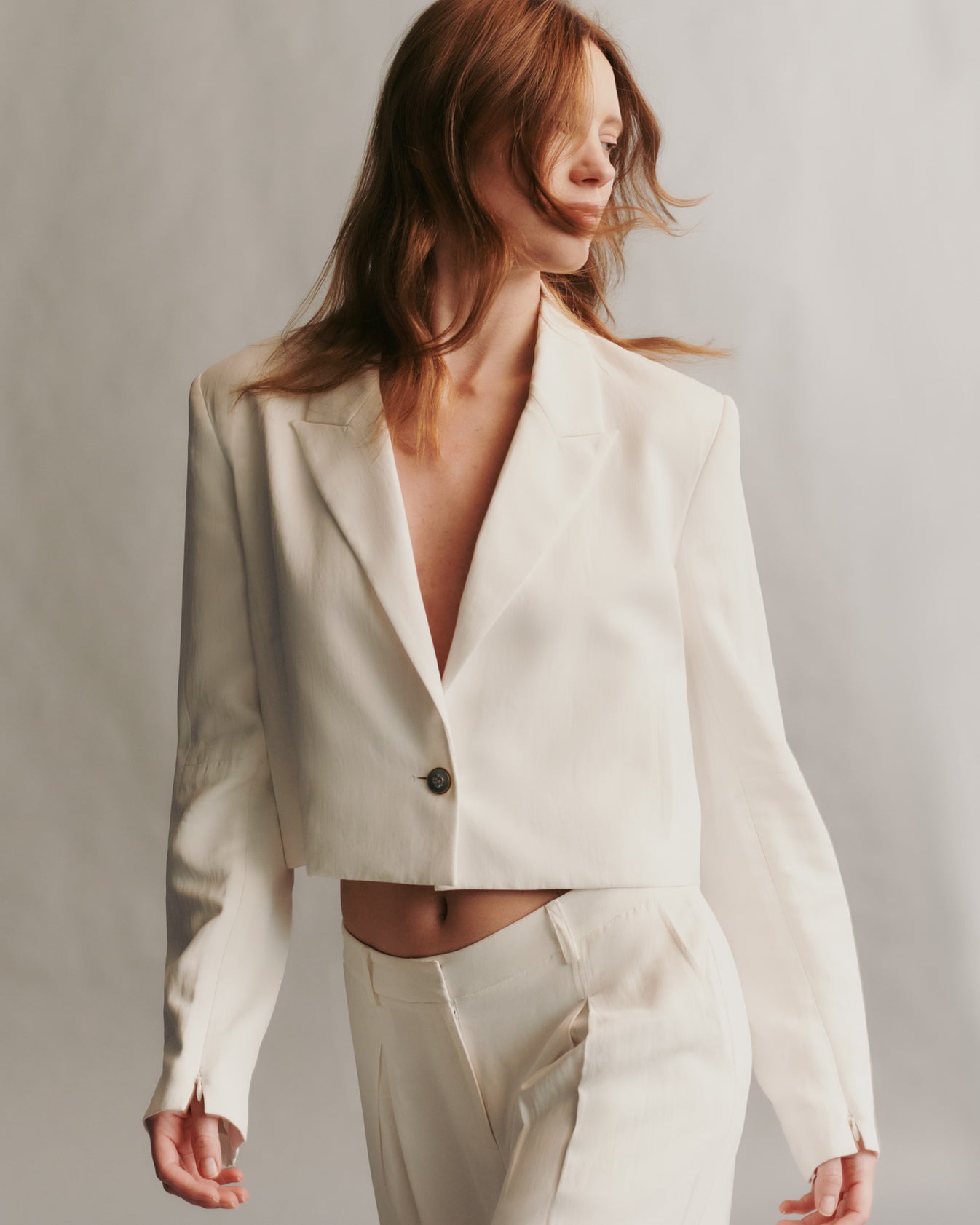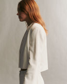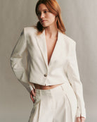 Cropped blazer crafted in lustrous, satiny smooth coated viscose linen. This broad shouldered, boxy silhouette is a one button jacket, complete with a pocket finish, and a hidden zipper at the sleeves.