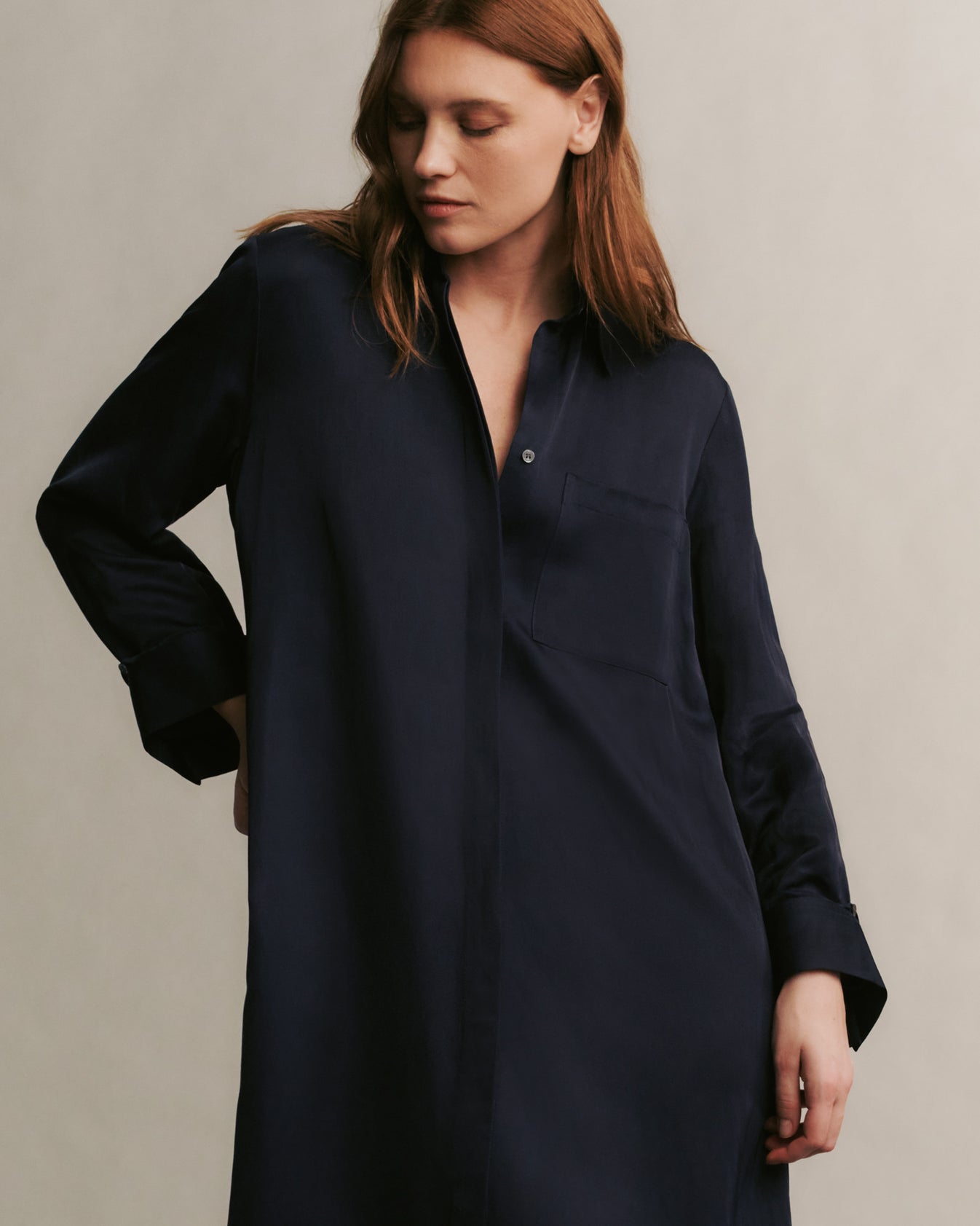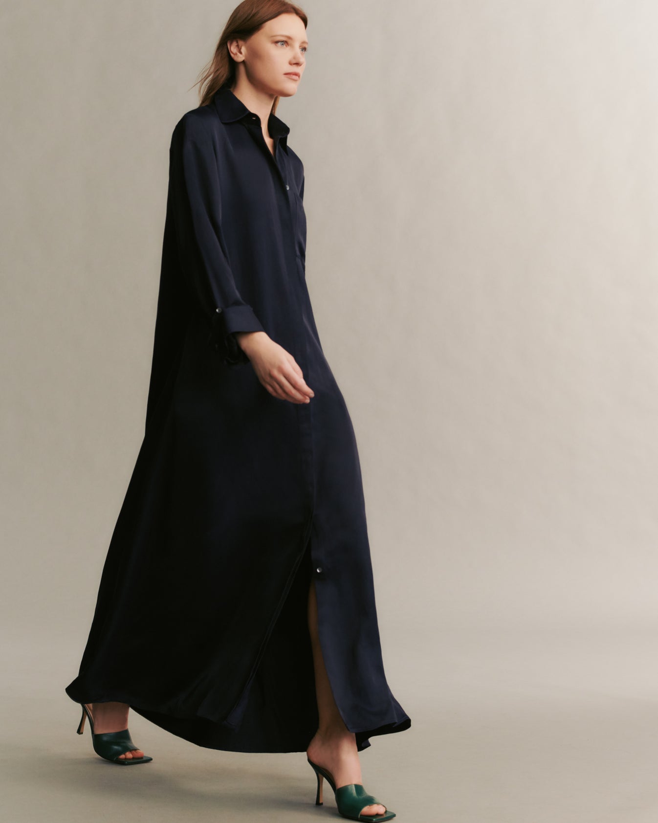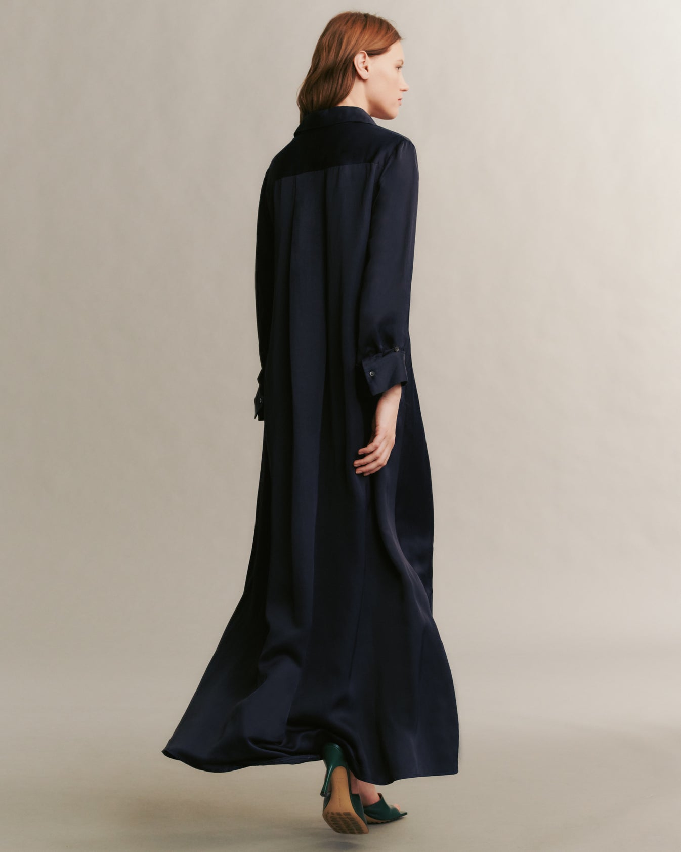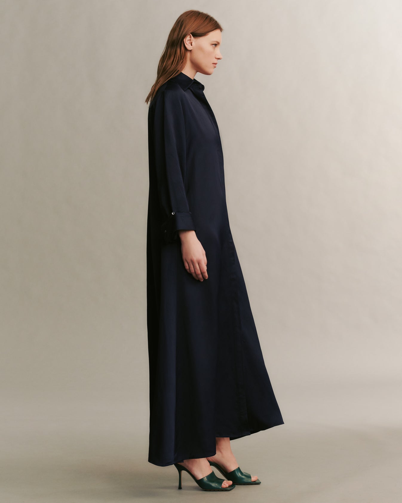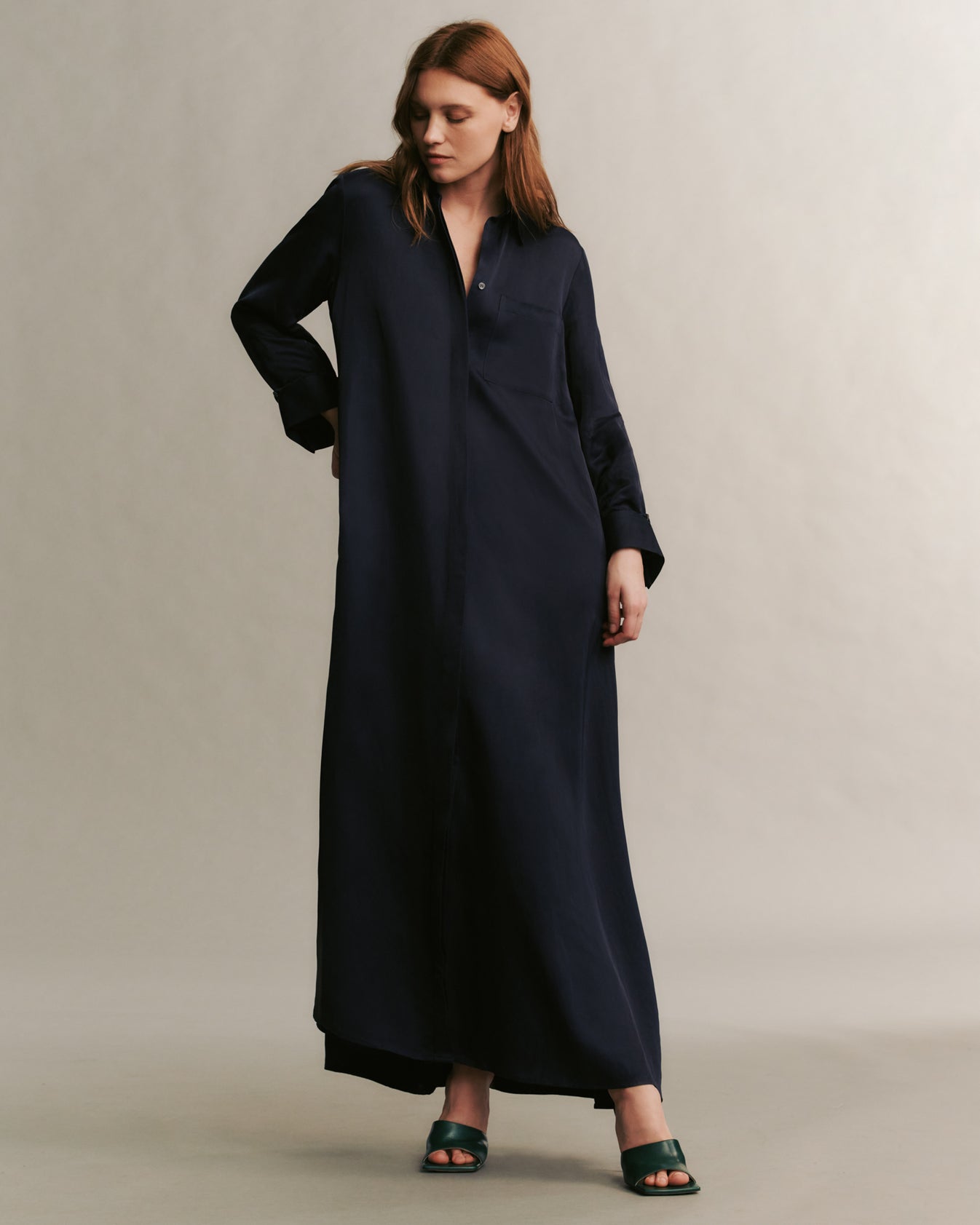 Oversized, flowing shirt dress crafted in polished, and sheen coated viscose linen. Jenny’s Gown showcases an elegant A-line silhouette, and is complete with a concealed placket, chest patch pocket, spread collar, and TWP’s signature single roll button cuffs.