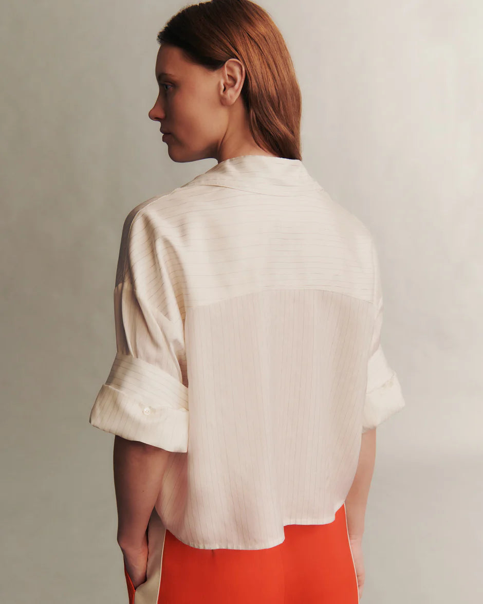 Signature short sleeved button down crafted in glossy metallic pinstriped silk. The Next Ex is a cropped, boxy silhouette, complete with a chest patch pocket, button up placket, spread collar, and double roll button cuffs.